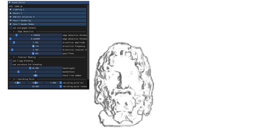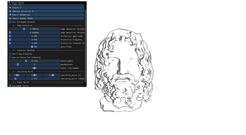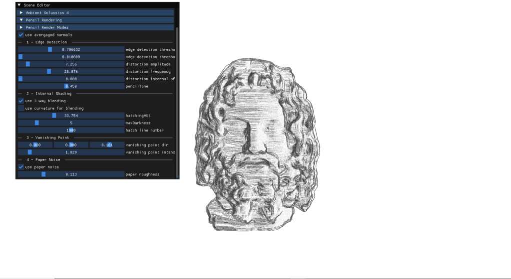 For my final project I had to implement a personal approach on a paper of my choice. After carefully thinking about it I chose to deliver an approach for Real-Time Pencil Rendering, based on the initial proposition conducted by POSTECH in 2006 that carefully explained their approach on how to render geometry in a way that it simulated human-drawn patterns.