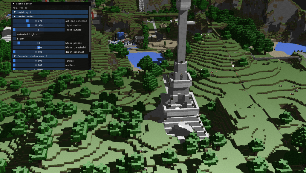 During the second part of the project I implemented optimized shadowing. For big scenes and specially for directional lights shadowing everything using a shadow map of the same resolution is usually not the best idea. Generally, areas that are further away from the camera don’t require great resolutions, since they will be less relevant to the visual output.