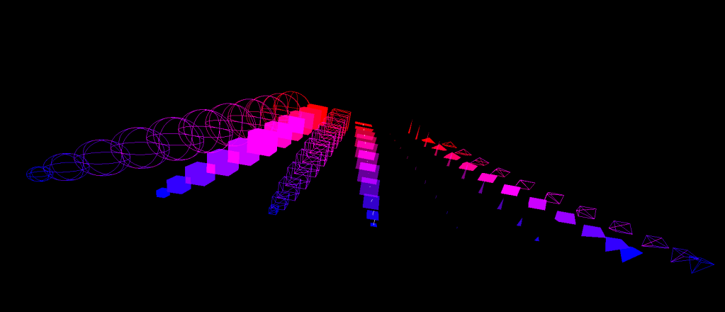This first part of the project consisted on creating the pipeline from scratch and integrating OpenGL for rendering. The general idea of this setup was to create an environment that would allow me to navigate through the space to see and test different geometry. I created a series of simple geometry loaded through code and rendered them in opaque and wireframe modes to test their visibility. In the same way I programmed a camera that would allow me to freely move through the scene.