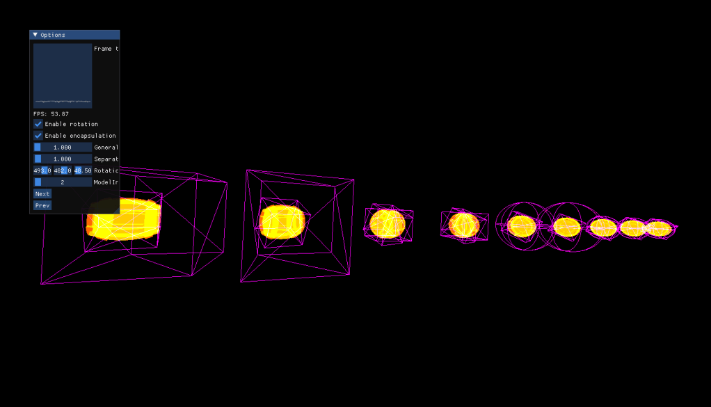 Once I had created the Bounding Volumes per se I tried to integrate them into Bounding Volume Hierarchies for big scenes. Although I already had frustum culling it was not sufficient for the performance issues that I had in the bigger scenes, and BVHs were the solution for this. I implemented three methods that generated a hierarchy depending on certain weights and variables: Top-Down Algorithm, Bottopm-Up Algorithm and Insertion Algorithm. The main difference is in the way they are constructed and how they act as a tree.