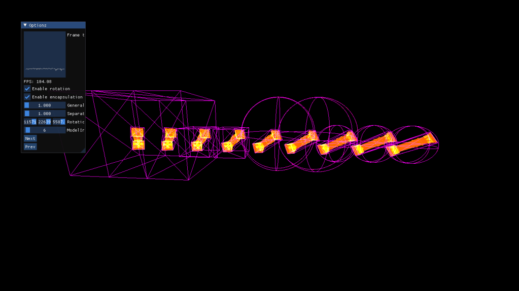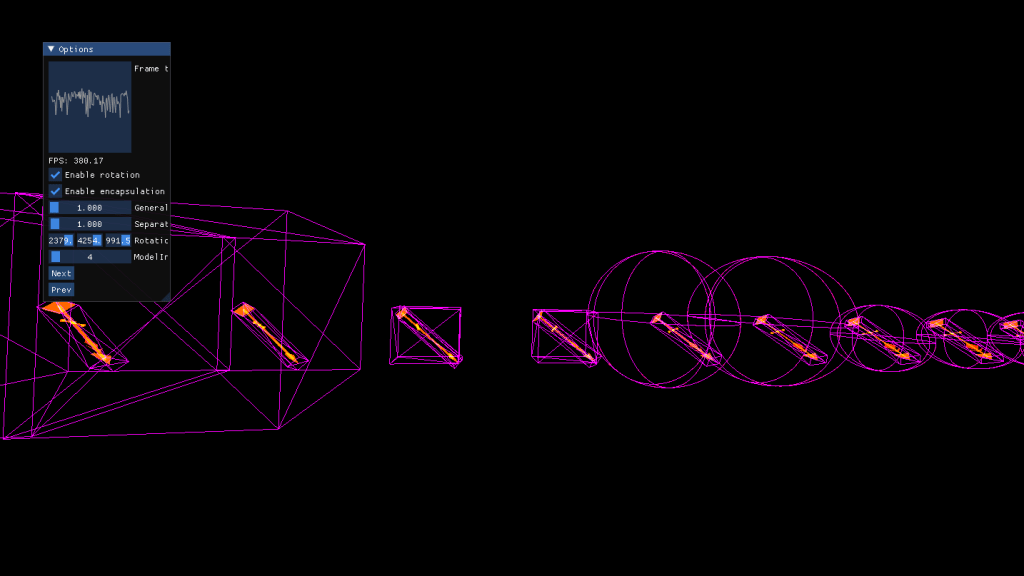 Once having the geometry well tied I designed different ways to encapsulate geometry as a prelude to the BVH part. For this I programmed a run-time loading system that allowed to change from model to model while showcasing how they would be encapsulating using different algorithms and shapes, Spheres and AABBs. Each one is computed differently and provides certain advantages and disadvantages, computing time, tightness, recomputation cost… Finally I integrated tinyobjloader so I could load more complex models and ImGui for fast changes in the scenes.