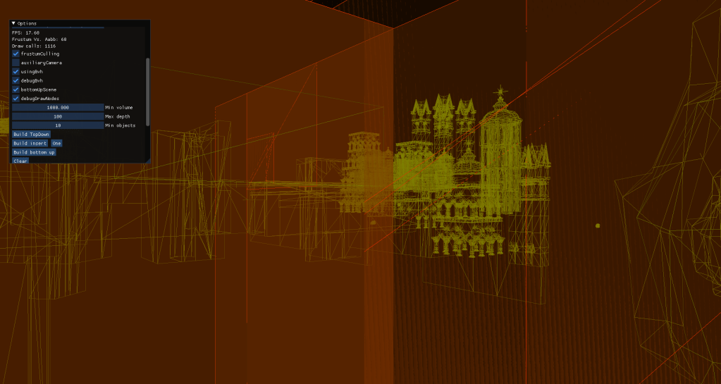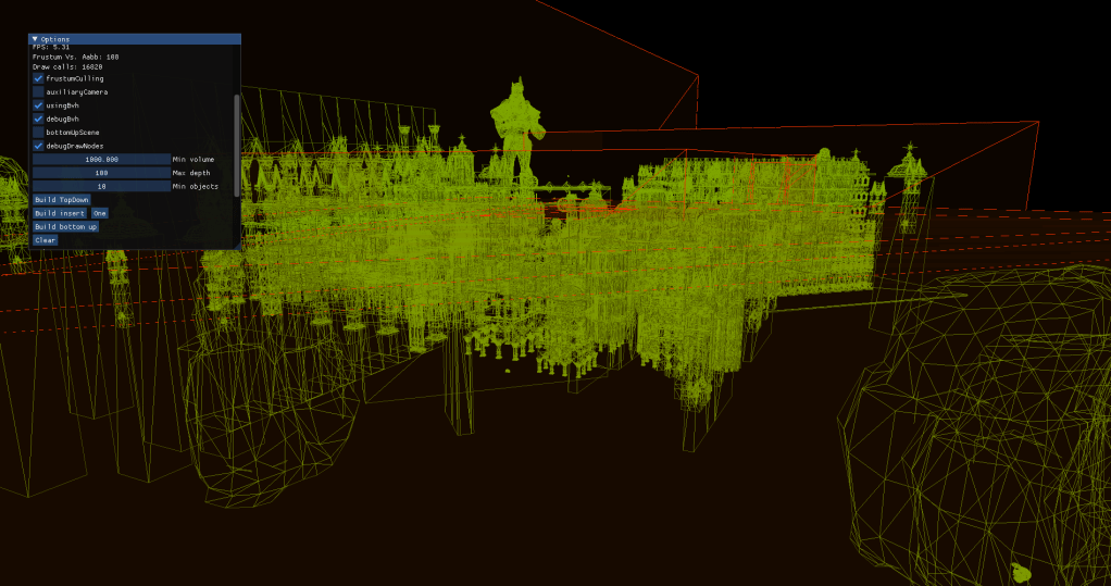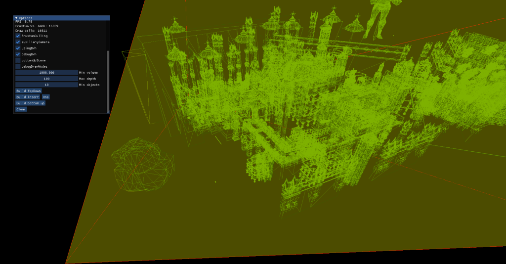 For the scene I programmed several tools that allowed me to see how BVHs of different types affected each scene. I integrated an auxiliary camera to see how frustum culling worked and added debug drawing of the nodes for the BVH.