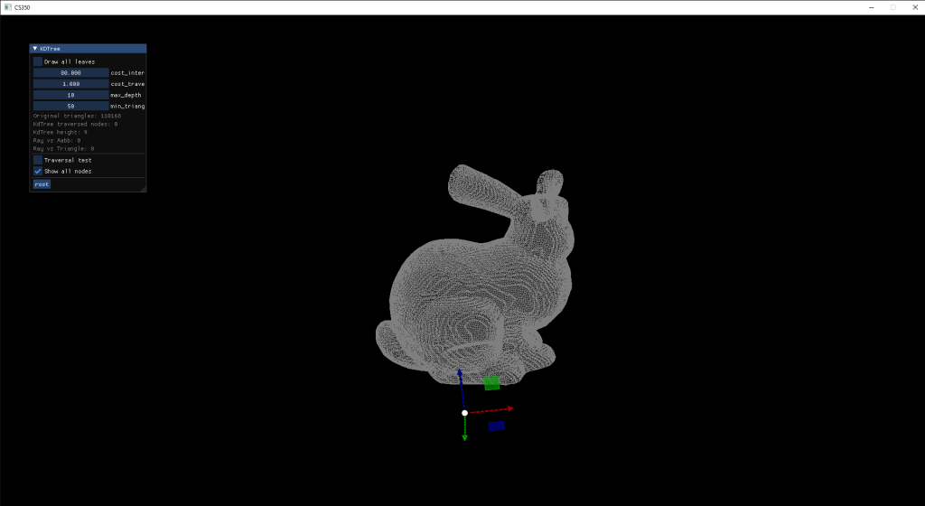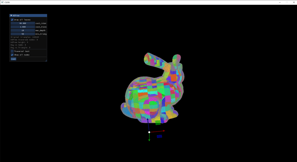 Finally, for Ray Intersections I tried integrating KD-Trees on geometry already computed. I visualized the leaves of the tree and then added a mode to see how the nodes would behave with ray intersections.