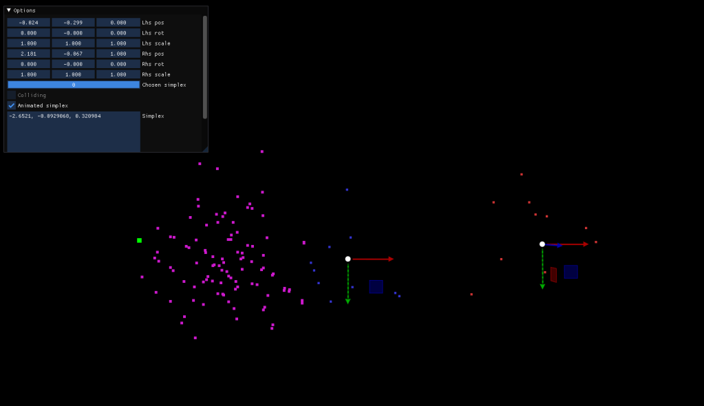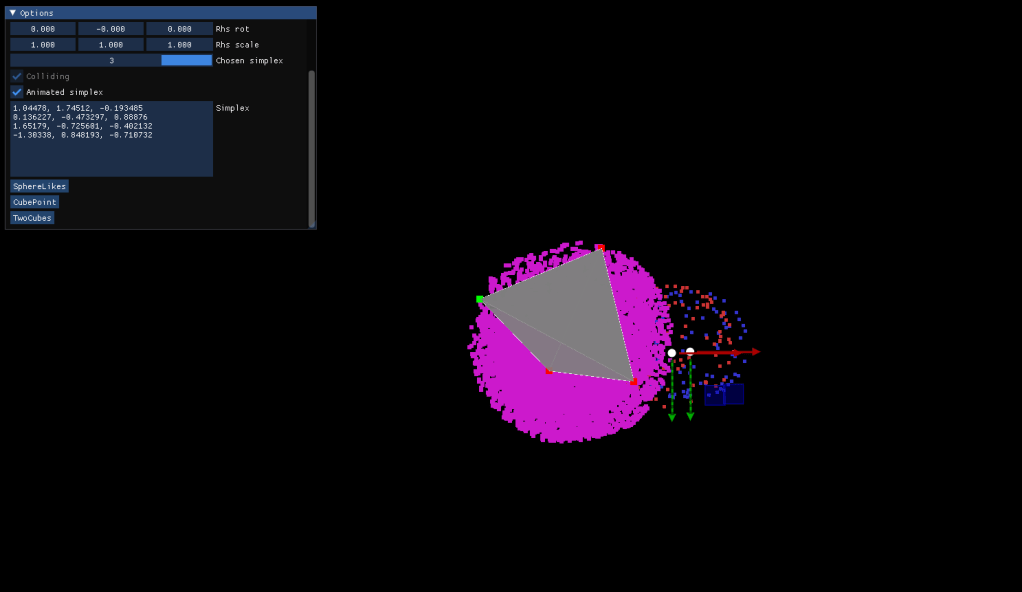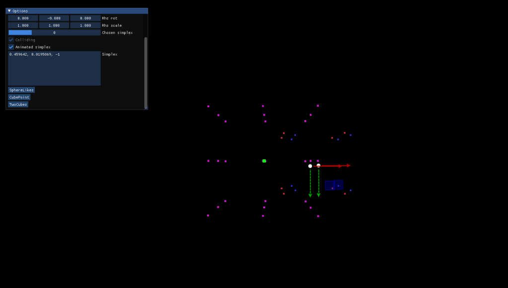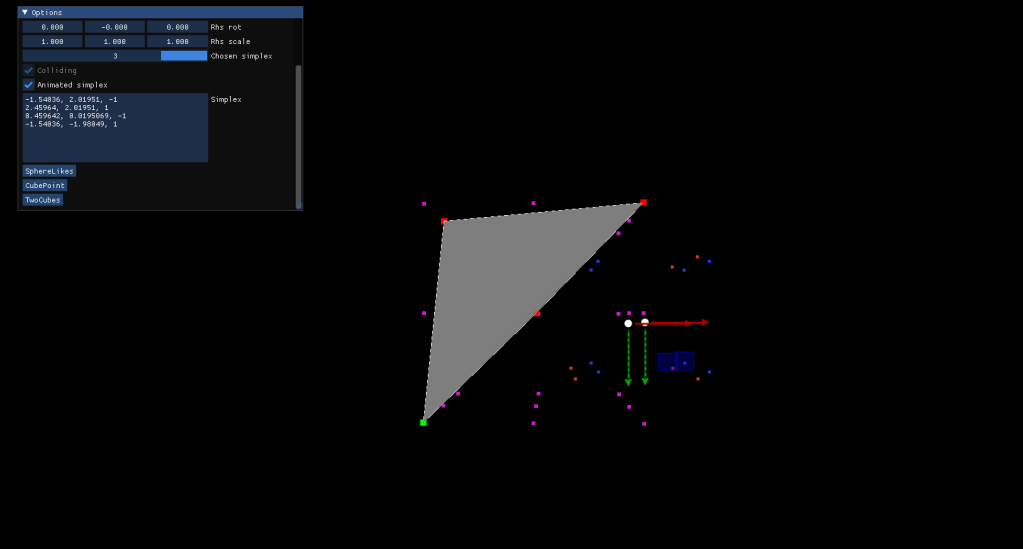 Gilbert-Johnson-Kirthii is an algorithm that uses Simplices generated from Voronoi Regions of the gemetry to detect if two convex shapes are overlapping. Essentialy, it requires to create the Minkowski Difference from the two shapes, and if the created simplex encapsulates the origin of the space an overlapping is happening.